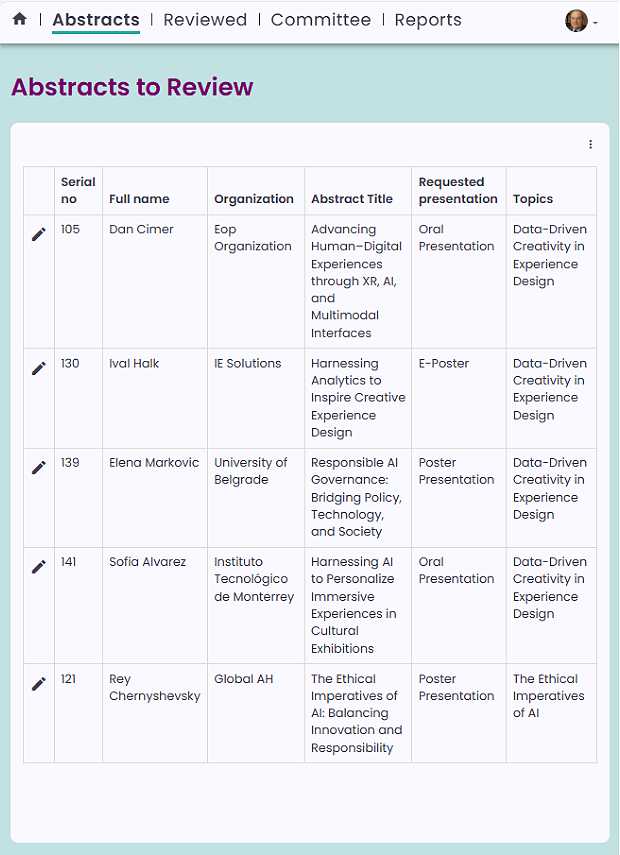 Each reviewer receives a secure magic link to access their personal review portal, where they see only the abstracts assigned to them. Reviewers can view, edit, and track reviews they’ve completed. Abstract assignment can be done: