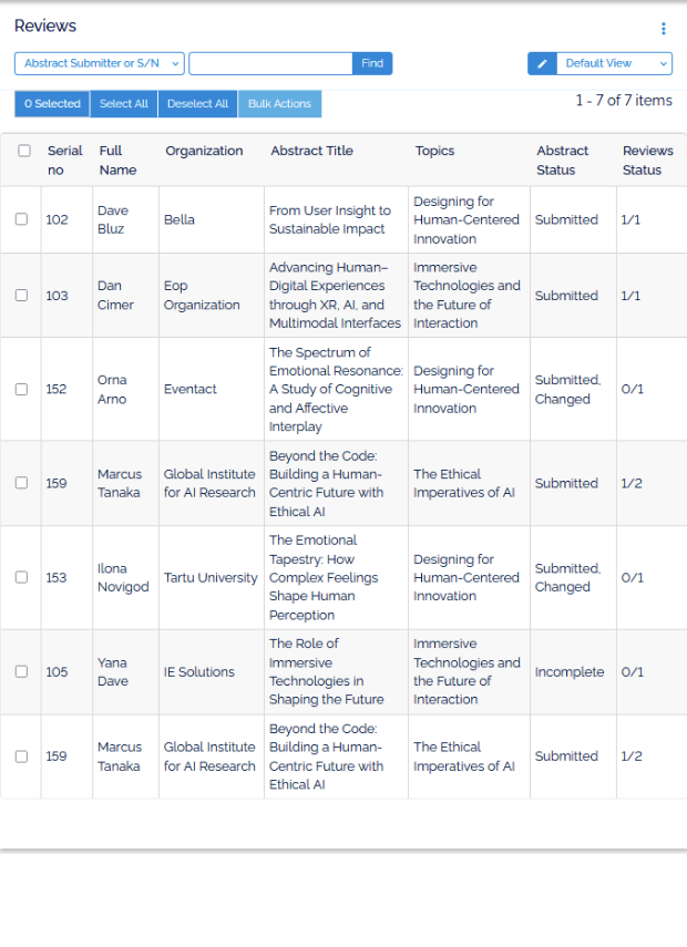 All reviews are automatically collected. Organizers and chairpersons can view scores, notes, and the weighted average per abstract. They can filter, track progress, and make final decisions — including assigning presentation formats (oral, poster, e-poster) and scheduling based on abstract quality and relevance.