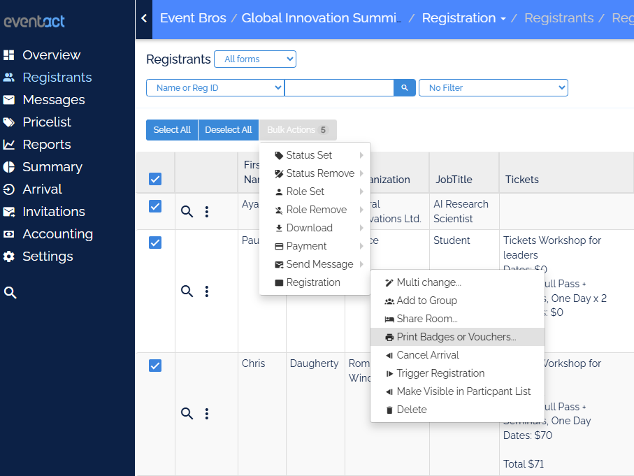 Sometimes, you need to print badges for an entire group (e.g., a company delegation, all speakers, or a specific registration type) to give to a coordinator for distribution. There are two primary ways to do this: