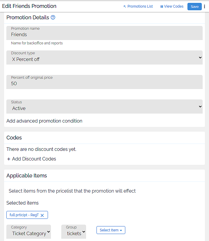 - Promotion Codes: Enter at least one code the registrant will type in. You can enter multiple codes separated by commas. Additional codes can be added later.